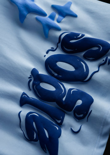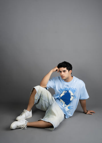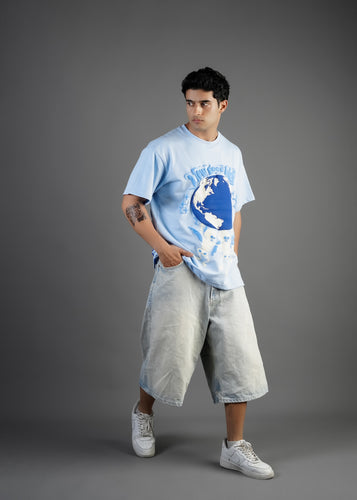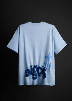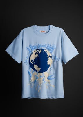 Celebrate positivity with the Afterlife Tee. This pastel-blue shirt features a playful globe graphic surrounded by angelic figures and uplifting typography. Soft tones and smooth print details make it a perfect piece for a fresh, youthful look.